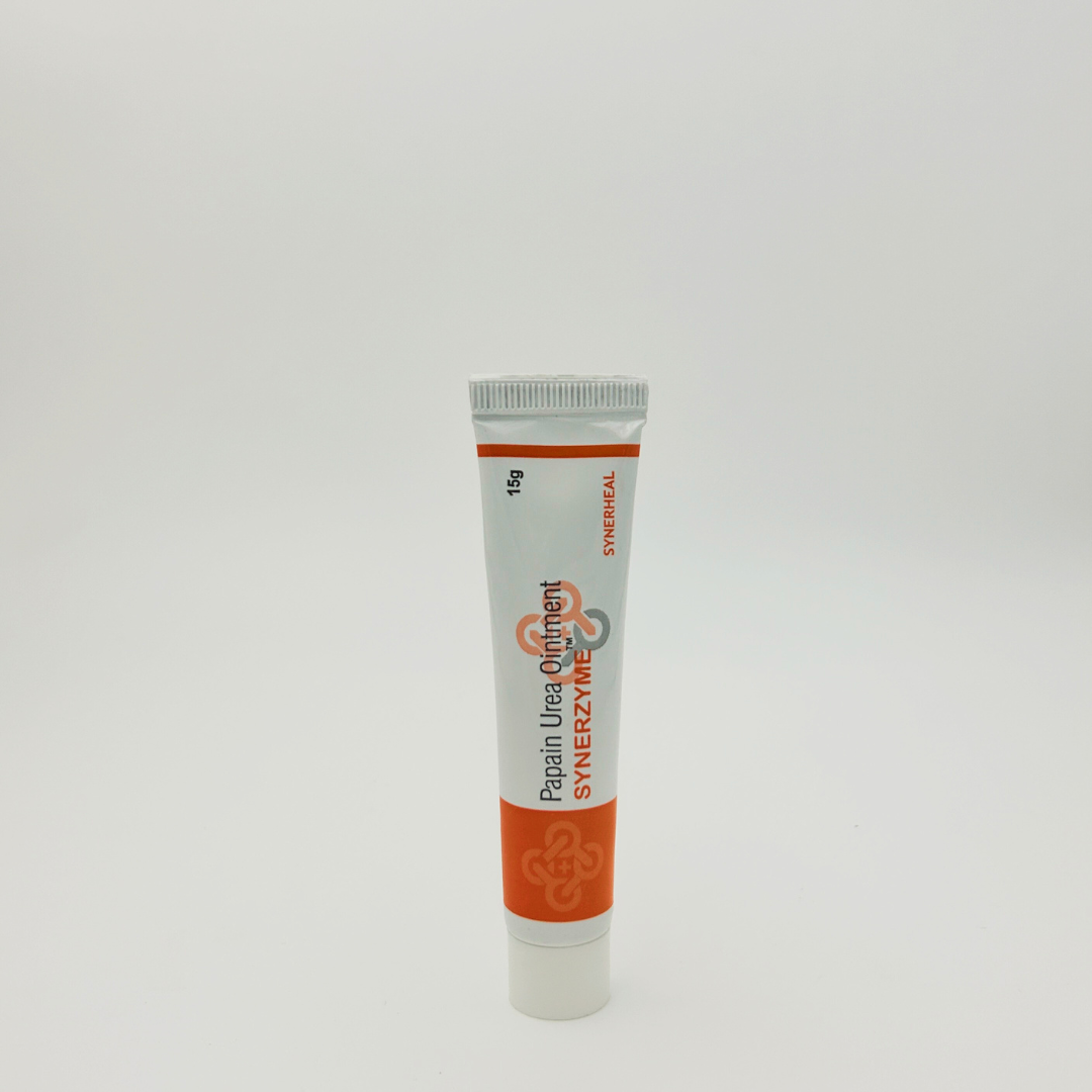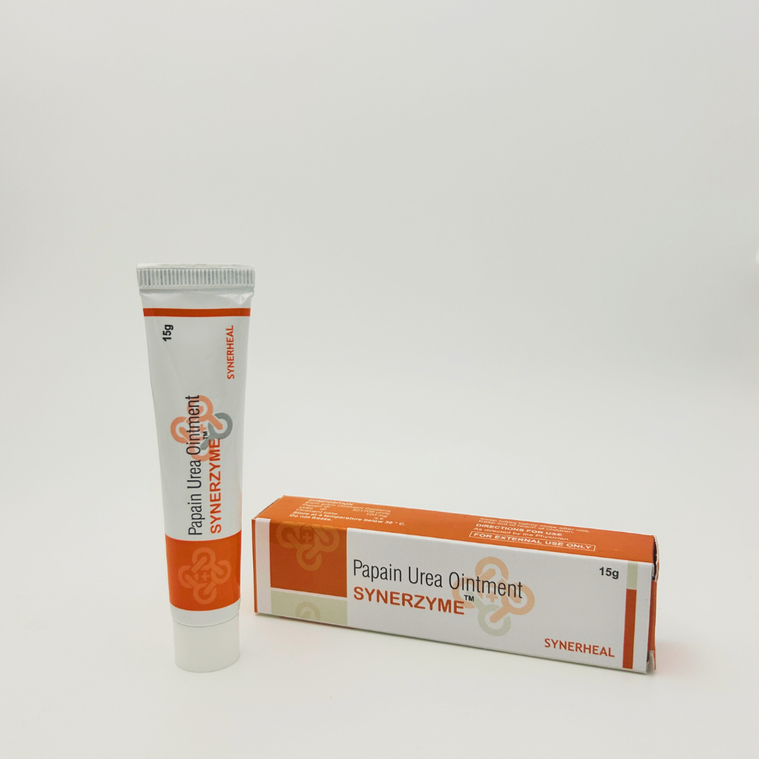 - सिनर्जाइम ऑइंटमेंट में पपेन और यूरिया होते हैं और वे घावों से मृत त्वचा को हटाने और उपचार में तेजी लाने में मदद करते हैं। यह घावों (अल्सर, सिस्ट, बेडसोर, सर्जिकल घाव) में मौजूद मवाद को पतला करने में भी मदद करता है। ये दोनों दवाएं त्वचा में नमी बढ़ाती हैं और केराटिन (त्वचा की बाहरी परत पर मौजूद प्रोटीन) को घोलती हैं। यह प्रभाव मृत त्वचा कोशिकाओं को गिरा देता है और उपचार प्रक्रिया को तेज कर देता है। इसका कोमल प्रभाव भी होता है और त्वचा को मुलायम बनाने में मदद मिलती है।
